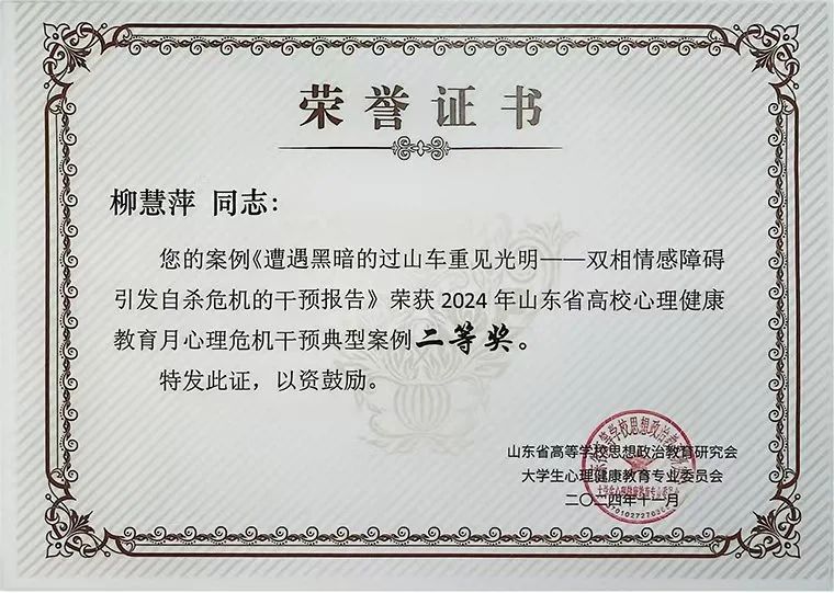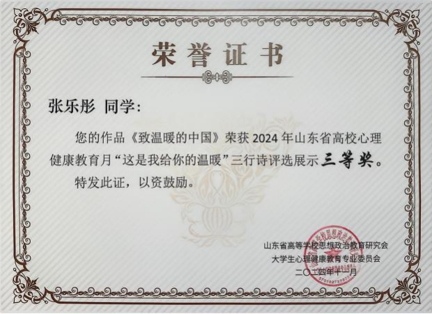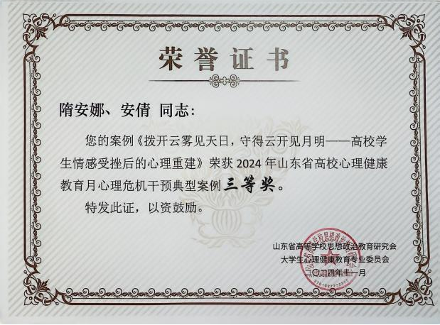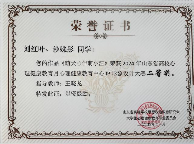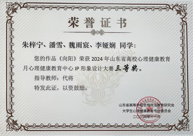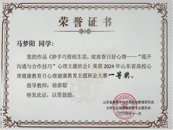 在山东省高等学校思想政治教育研究会、大学生心理健康教育专业委员会组织的2024年山东省高校心理健康教育展示大赛中,我校师生再获佳绩,共计6项作品获奖,其中一等奖1项、二等奖2项、三等奖3项。
