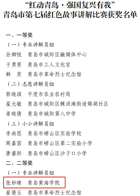 近日,由青岛市委宣传部、青岛市委网信办、青岛市委党史研究院、青岛市教育局、青岛市文化和旅游局、青岛市国资委共同组织开展的“红动青岛·强国复兴有我”青岛市第七届红色故事讲解比赛成绩揭晓,青岛黄海学院影视学院学生张妙晴在比赛中获得专业讲解员组二等奖。