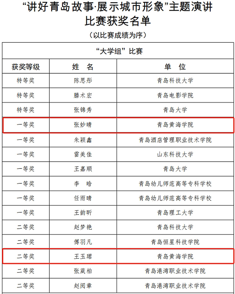 在青岛市大中小学“思政微课堂”宣讲比赛中,我校影视学院学生张妙晴、王玉珺在“讲好青岛故事·展示城市形象”主题演讲比赛(大学组)中获得一等奖、二等奖。