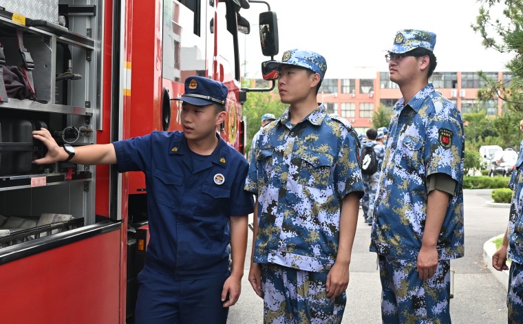 疏散演练结束后,教官与学友导师带领新生开展灭火演练。安全管理处工作人员现场讲解疏散逃生安全注意事项,演示干粉灭火器“提、拔、握、压”操作方法,并组织新生代表实操扑灭真火;同时消防战士展示了消防车随车设备,让新生“零距离”感受消防。