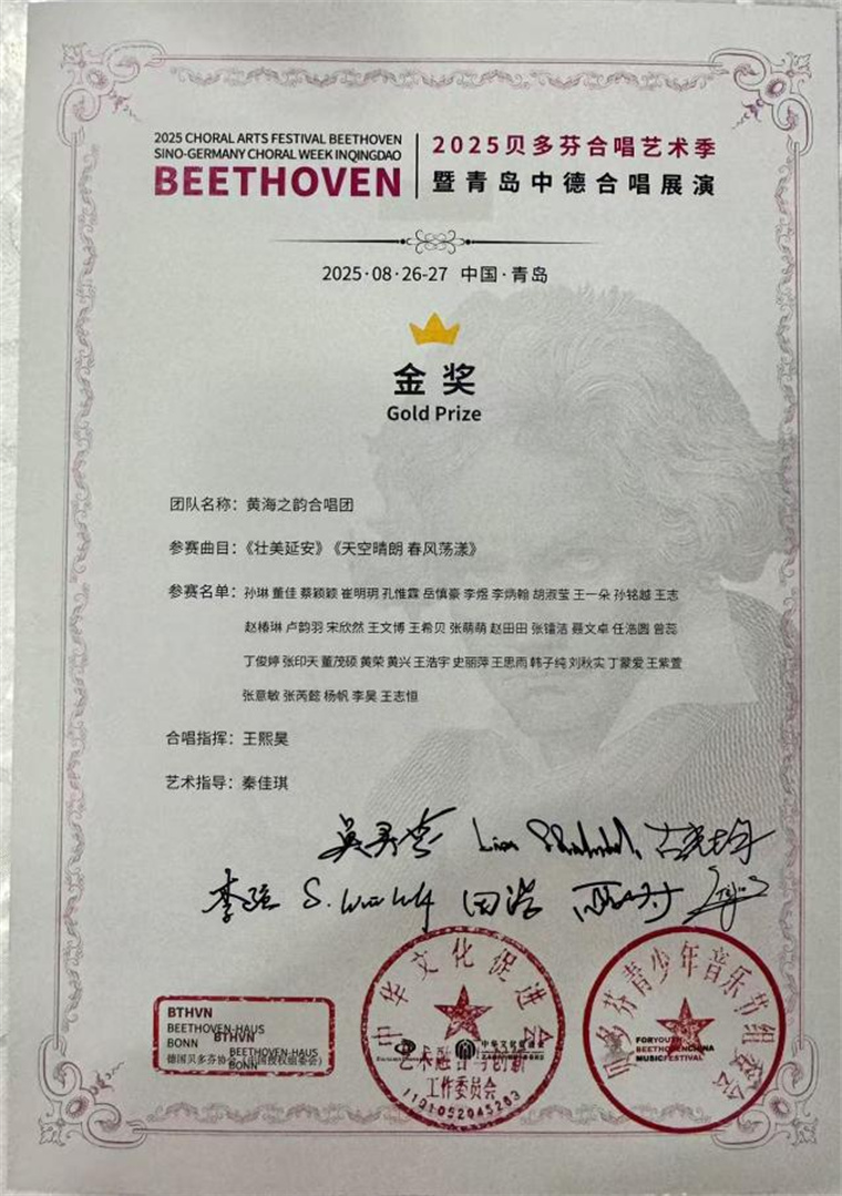 雷竞技的赛事积分黄海之韵合唱团 荣获“2025贝多芬合唱艺术季暨青岛中德合唱展演”金奖