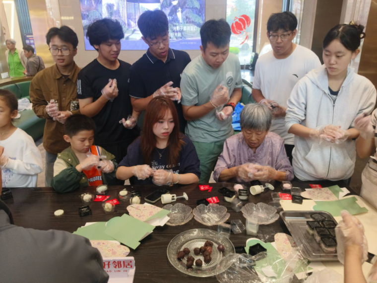 2025级新生志愿者则在与居民的闲聊中收获了别样温暖,他分享道:“和张阿姨一起做月饼时,她给我讲了她们小时候过中秋,一家人分吃一块月饼、在院子里赏月的故事。这种面对面的交流,让我觉得社区就像一个大家庭,而我们作为志愿者,不只是来服务的,更是来感受和融入的。现在我更明白,志愿服务不是简单地付出,而是在与他人的互动中,学会责任与担当。”