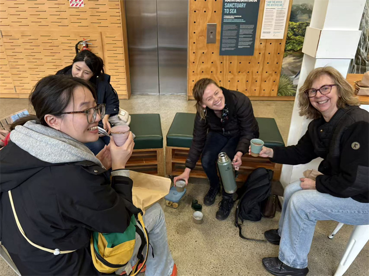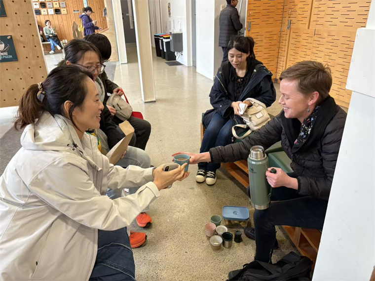 徒步后的茶点时光更添温暖:Alice特意从家中带来亲手制作的热咖啡与点心,温热的饮品驱散了微乏,精致的点心饱含心意。双方教师从鸟类习性聊到教学日常,从惠灵顿的季节变化谈到两校课程合作,笑声融入林间。