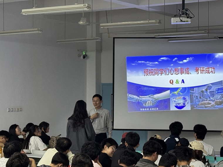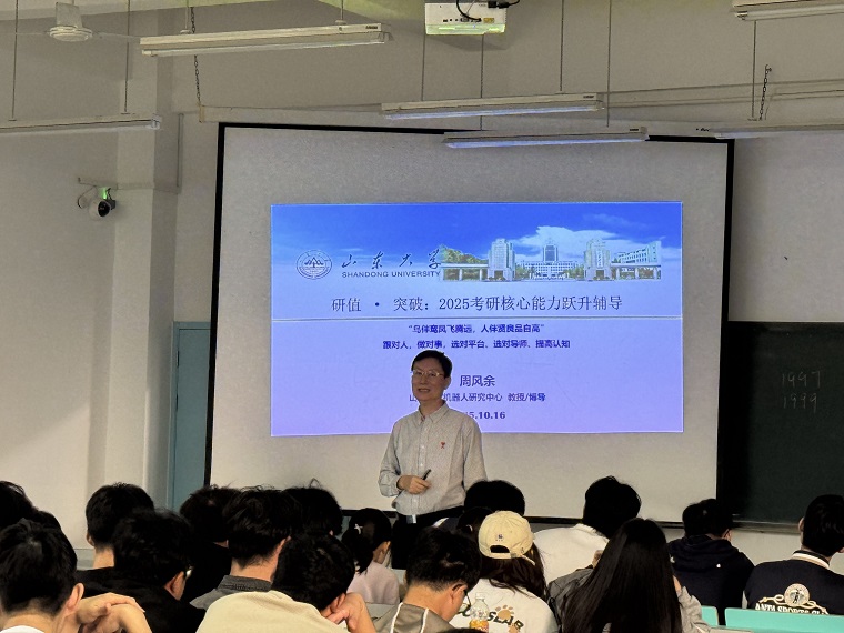 活动的最后环节,周风余教授面向有考研意向的学子们做了一场精准的考研指导报告。他结合山东大学等高水平大学的招生要求,从考研形势分析、院校专业选择、备考战略规划、复试技巧等关键环节,为同学们进行了系统梳理和权威解读。周教授鼓励同学们要尽早明确目标,科学制定复习计划,并着重强调了夯实专业基础知识和培养综合创新能力的重要性。在互动环节,同学们踊跃提问,周教授均给予了耐心细致地解答,现场气氛热烈。这场报告为正处于迷茫与焦虑中的学子们点亮了一盏明灯,极大地增强了他们的备考信心。