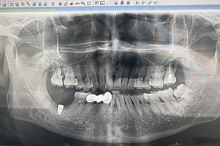 在切口环节,他运用手术刀在牙槽嵴顶完成精准的弧形切口,最大限度地保护了患者的牙龈组织。从先锋钻定位、序列钻头扩孔,到种植体精准植入预设位置,整个过程一气呵成。术后即刻验证显示,种植体实际植入位置与术前数字化设计完全吻合。最终,手术以可吸收缝线的精细缝合画上句号,创口对合整齐,出血量极少。