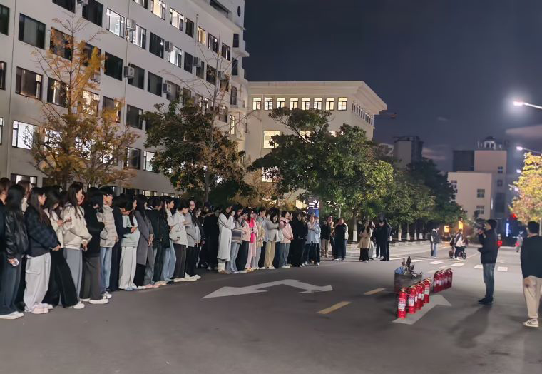 下午16时,模拟火情警报响起,师生在辅导员、宿舍管理员及学生干部引导下,快速关闭电源,弯腰低姿沿预定路线有序撤离,安全抵达集合点后,各楼栋负责人及时清点人数、核对上报。夜间19时,针对视线差、易慌乱的特点,引导人员沿途指引,重点关注行动不便学生,提醒“放慢速度、保持间距”,确保全员平稳撤离。
