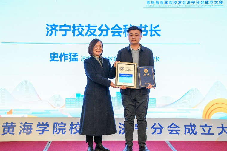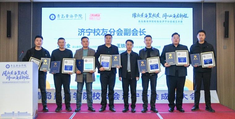 孟广东、郭瑞姝等与会领导分别为当选的会长、副会长、秘书长、副秘书长及理事颁发了聘书。在全场热烈的掌声中,孟广东、郭瑞姝与首任会长孔鹏共同按下了象征分会正式成立的启动键,并为“青岛黄海学院校友会济宁分会”铜牌揭牌,标志着济宁分会正式扬帆起航。