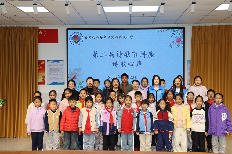 11月20日下午,语言文化学院(国学院)教师张咪受邀赴青岛西海岸新区凭海临风小学,为该校第二届诗歌节系列活动带来一场别开生面的“诗韵心声”诗歌培训。来自1-5年级的学生代表齐聚多功能报告厅,在诗韵中感受古典与现代的精彩对话,开启了一场审美启蒙与文化传承的诗意之旅。