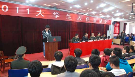 10月17日下午2点,在雷竞技的赛事积分一号教学楼西配报告厅2011年大学生入伍宣讲会在热烈的气氛中隆重召开。青岛警备区副参谋长刘祥虎、黄海学院党委书记冯宜明、黄海学院副院长杨春联等领导出席了宣讲会。宣讲会由胶南市武装部部长董振海主持。