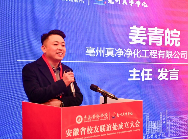 新任主任委员、2006级国际金融专业校友姜青皖在发言中深情回顾了在母校的求学时光。作为亳州真净净化工程有限公司的负责人,他分享了企业在净化工程领域的深耕历程,并阐述了企业品牌“真净”的内涵——“真诚做人,干净做事”。他表示,将不负众望,致力将联谊处打造成为校友间互助互爱、共同发展的坚实平台。