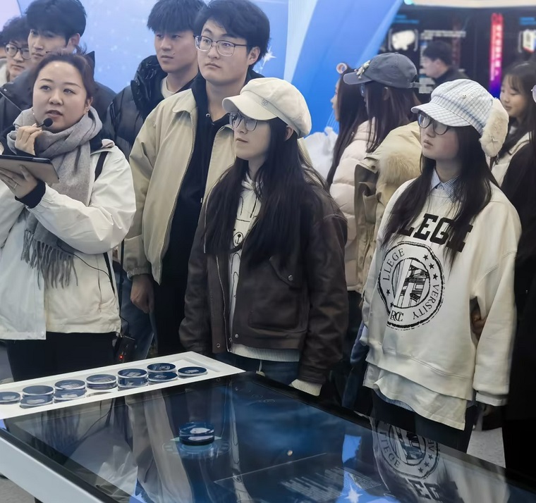 展览大厅内,企业发展历程、核心技术、明星产品与荣誉资质集中呈现。从2011年创立至今的技术突破,到变频调速一体机、永磁同步变频一体机等核心产品的实物展示,再到500余项专利授权、山东省科技进步一等奖等荣誉,全方位展现了中加特的技术实力与行业地位。同学们近距离观察高功率密度、高传动效率的变频一体机样机,聆听讲解人员关于产品技术优势介绍,对智能制造在工业传动领域的应用有了直观认知。