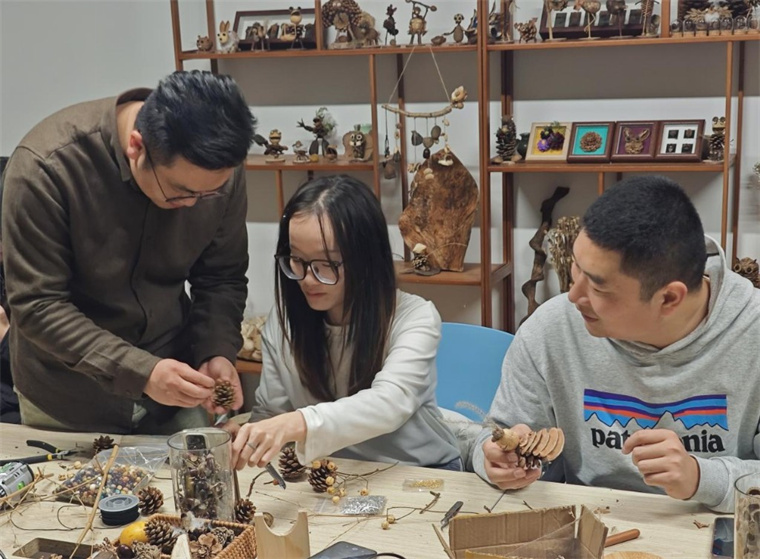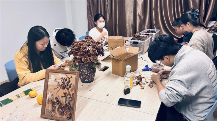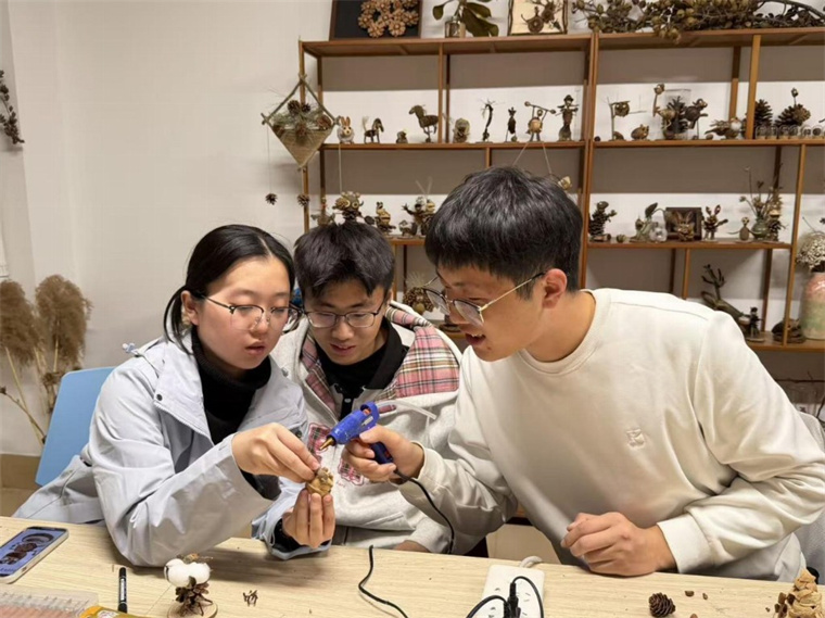 “草木拾心 ”手工室始终坚持经验凝练与品牌打造双轮驱动,着力推动劳动育人成果系统化、可复制、可推广。在文化传播方面,打造“草木拾心 ”新媒体传播矩阵,常态化推出手工活动推文、优秀作品展示等优质内容,构建起贴近学生、便捷高效的自然教育“掌上课堂 ”。在文创开发方面, 以学生原创优秀作品为基础,精心打造系列纪念文创产品,以文创为载体弘扬劳动精神、传递美育理念。在模式推广方面,工作室建设成果在校级层面作专题交流,获批校级辅导员领航工作室立项,为大中小学劳动教育一体化提供了可借鉴、可复制、可推广的实践范式。积极推动学生作品向文创产品转化,现已形成“松果萌兽、枯枝生灵 ”等特色展示样品 100 余件,扎实构建“实践+创新+创业 ”三位一体育人模式,让劳动教育成果看得见、摸得着、用得上、可转化。