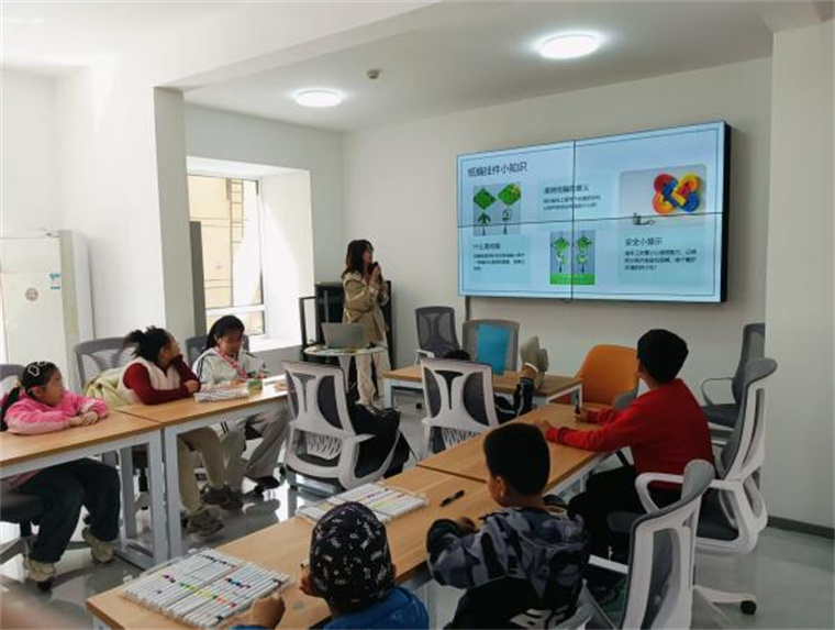 最后,志愿者与孩子们一起制作清明主题纸编挂件。大家先将彩纸剪成14条等长纸条,随后在志愿者的指导下交错编织成小网格,最后用彩笔和贴纸装饰上青团、柳枝等清明元素。孩子们捧着自己的作品,在动手实践中感受传统节日的乐趣。
