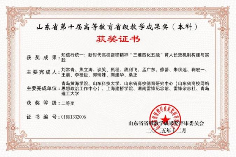 近日,《山东省教育厅关于开展第十届高等教育省级教学成果奖评选工作的通知》(鲁教高函〔2025〕21号)及评审结果公示,我校马克思主义学院在山东省第十届高等教育省级教学成果奖评选中喜获3项二等奖,实现历史性突破。其中,学院主持申报的《新时代高校思政课“四化”实践教学体系的创新与实践》《知信行统一:新时代高校雷锋精神“三维四化五融”育人长效机制构建与实践》两项成果均荣获本科类二等奖;另有参与完成的《四方联动·四链融通·学用贯通:跨境电商应用型人才培养模式十年创新实践》项目,作为联合申报单位也获得本科类二等奖。