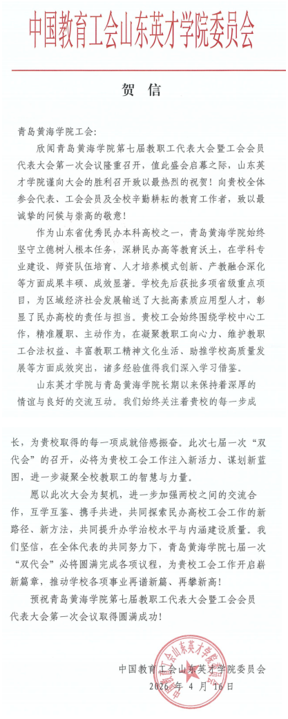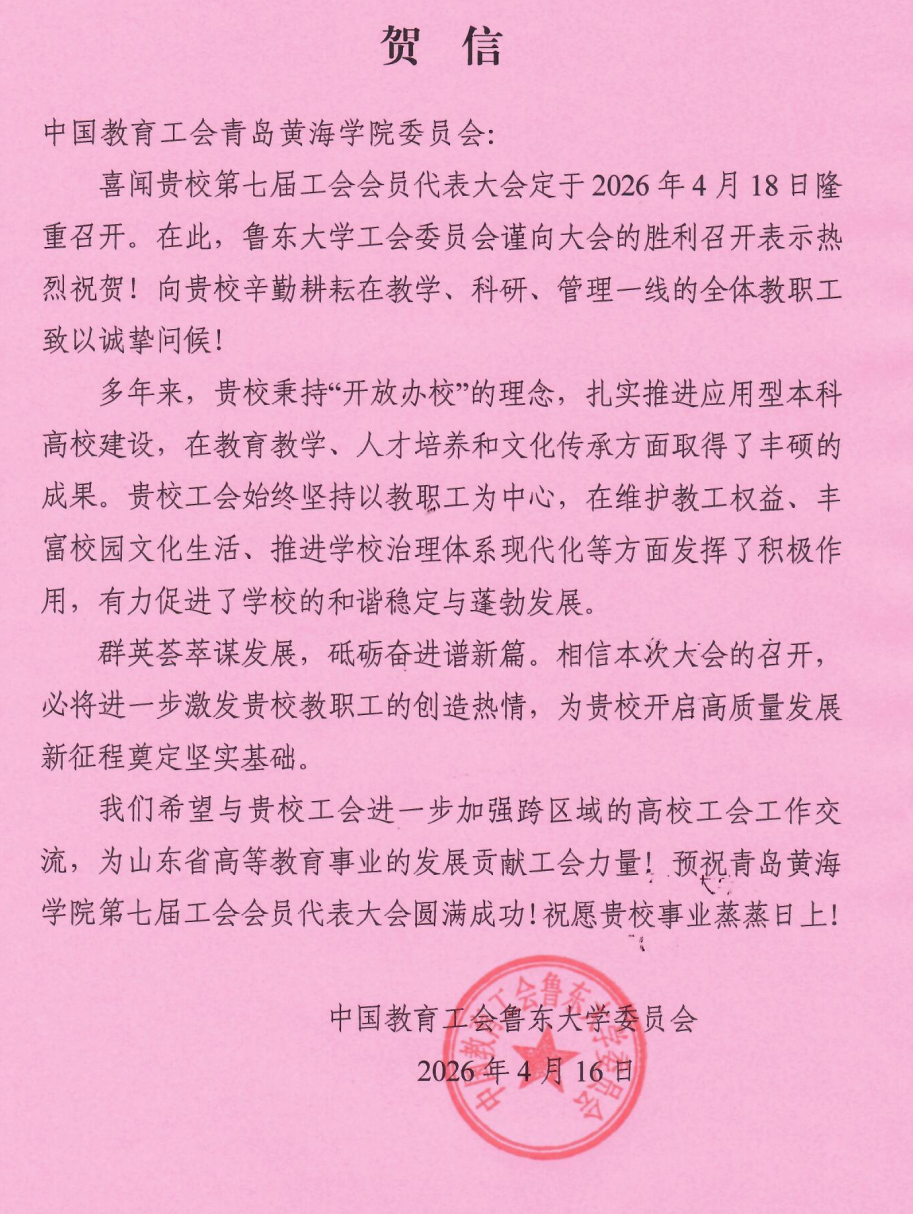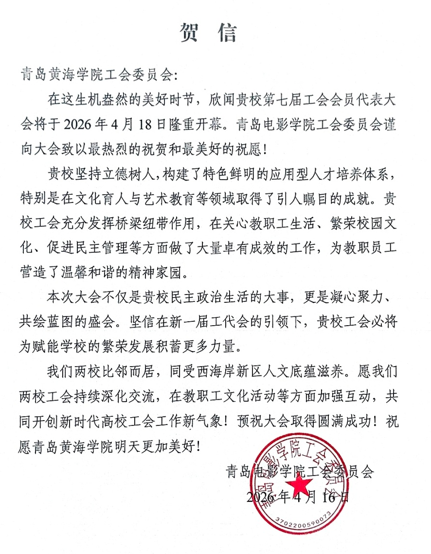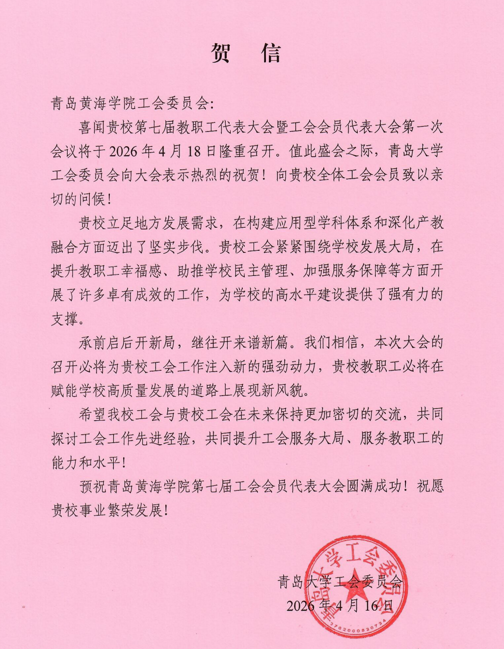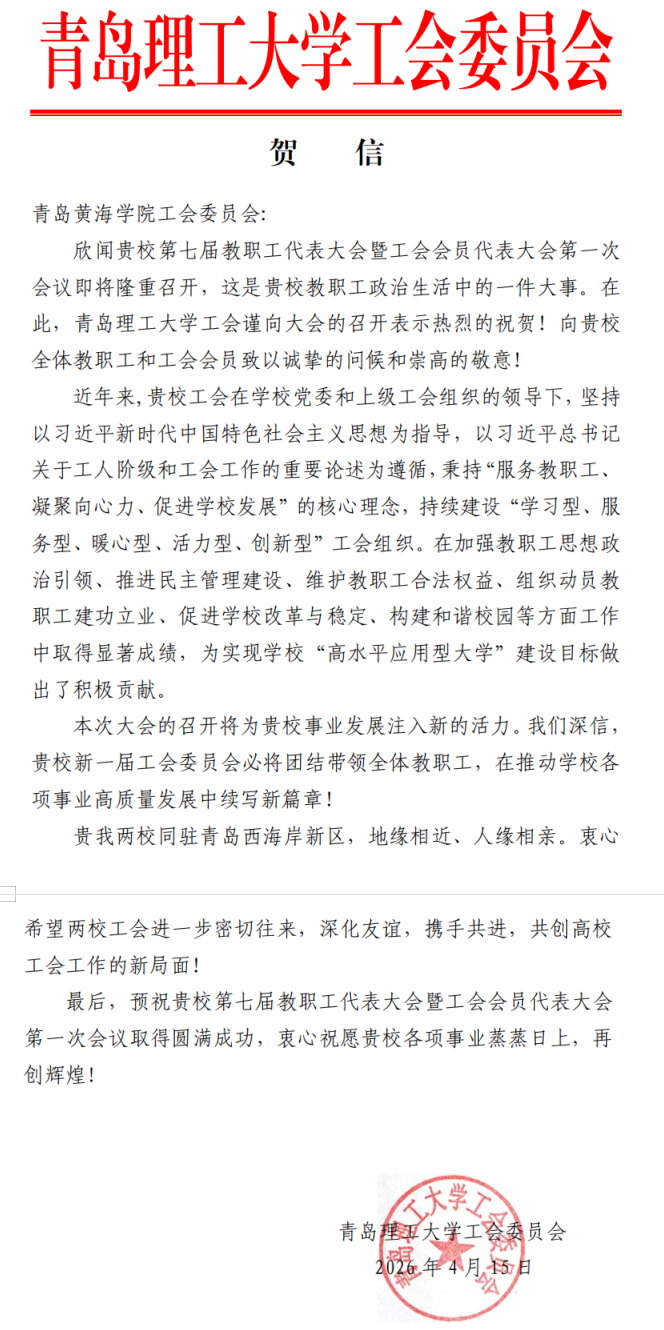 喜迎“双代会”,凝聚奋进力量!为祝贺雷竞技的赛事积分第七届教职工代表大会第一次会议暨第七届工会会员代表大会第一次会议顺利召开 ,我校陆续收到了青岛市总工会及各兄弟高校工会发来的贺信 。在此,希望与全体教职工及所有的工会会员们共享这份喜悦!