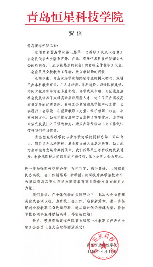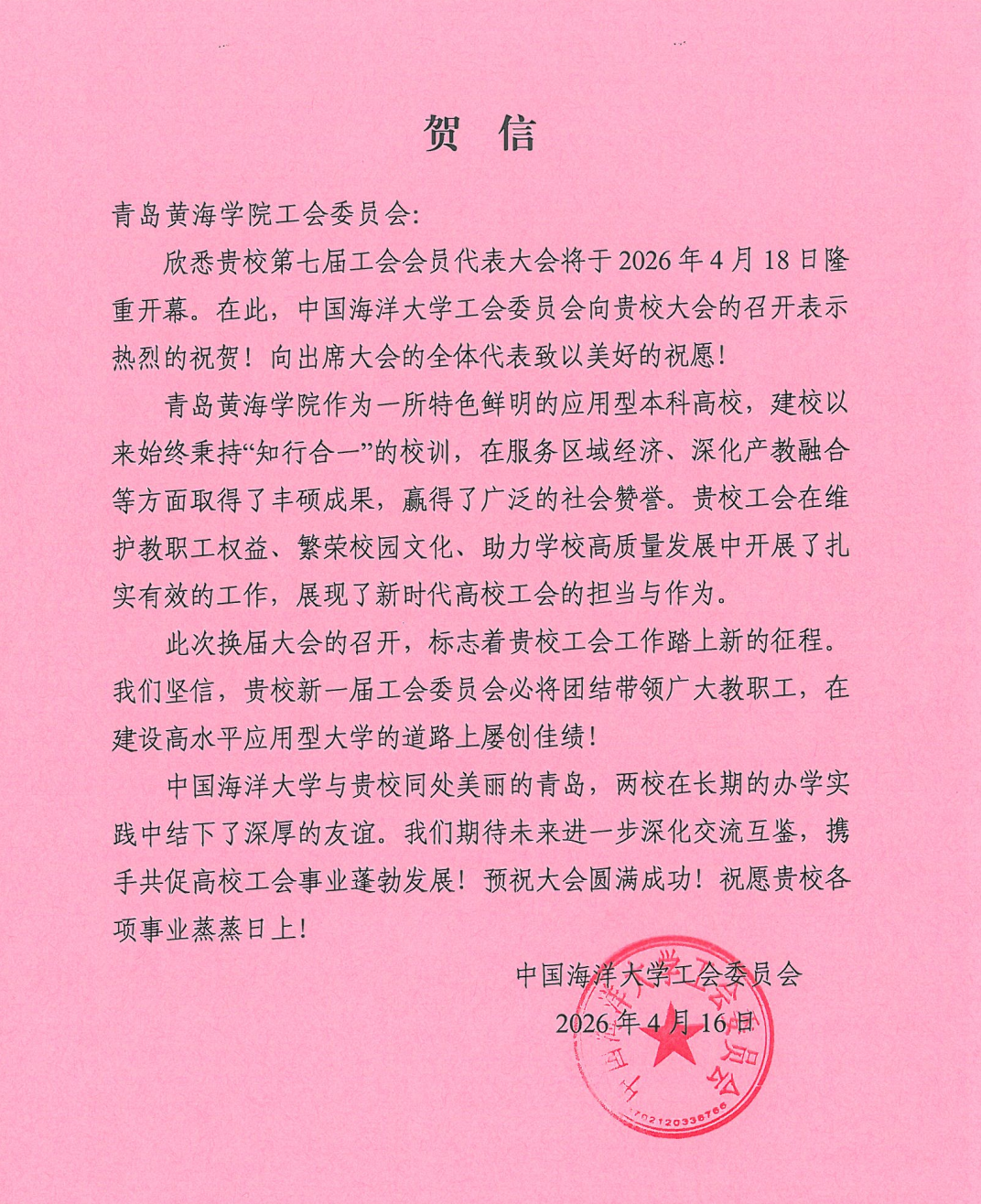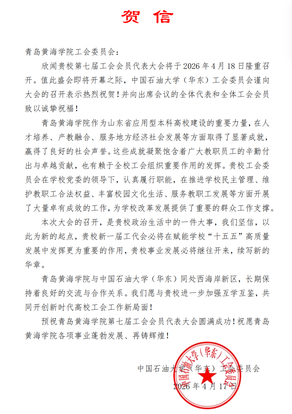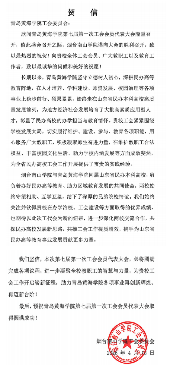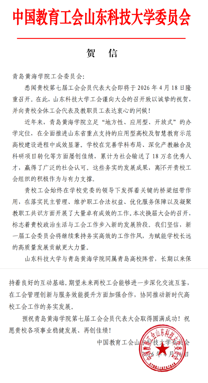 喜迎“双代会”,凝聚奋进力量!为祝贺雷竞技的赛事积分第七届教职工代表大会第一次会议暨第七届工会会员代表大会第一次会议顺利召开 ,我校陆续收到了青岛市总工会及各兄弟高校工会发来的贺信 。在此,希望与全体教职工及所有的工会会员们共享这份喜悦!