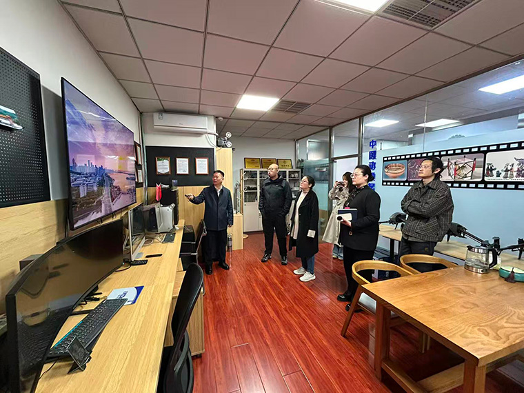 在企业方的热情接待下,学院一行参观了影视中心、后期制作中心及优秀影像成果展,青岛宝蓝智能科技有限公司在影视拍摄、创意设计、后期剪辑等领域积累的丰富经验和高质量成果,给学院老师留下了深刻印象。企业总经理薛良选、影视总监张洪涛、摄影师薛宏伟详细介绍了发展历程、业务布局与商业影视项目全流程运作模式,双方就行业技术趋势与岗位能力要求展开初步交流。