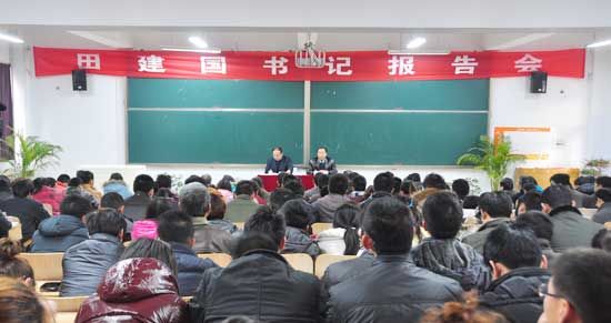 12月2日,应学院邀请,山东省政府参事田建国教授莅临我院,在学院一号教学楼二楼西报告厅分别以“深化高校内涵建设,推进学院整体转型”和“用社会主义核心价值体系引领学院文化建设——学习六中全会辅导报告”为题作了两场生动精彩的报告会。学院党委书记冯宜明、常务副院长贺永宜等学院领导与中层以上干部、二级学院班主任、辅导员及全体教师听取了报告。报告会由学院党委副书记宋庆泽主持。