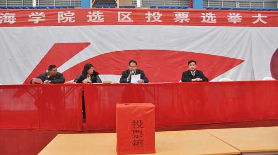 上午9时许,在投票主会场体育馆,学院副院长、黄海学院选区选举工作组组长杨春联主持了大会,学生处长、选区选举工作组副组长郭伟武宣读了《青岛市胶南市选举委员会关于选举区第十六届人大代表选举办法》。会议宣布了正式代表候选人名单,通过了监票人、计票人名单。在庄严、神圣的气氛中,选民们依次投下了神圣的一票。