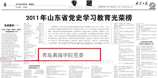 12月29日《大众日报》报道,我院党委荣获《2011年山东省党史学习教育光荣榜》——“学党史、增党性、当先锋”“先进基层党组织”。