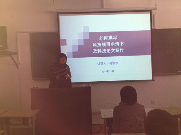 2014年11月14日我院兼职教授程学珍在知行楼525为全体任课教师做了一场关于如何撰写科技项目申请书及科技论文写作的报告。