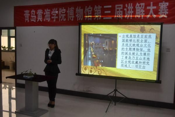 比赛过程中,选手的讲解内容与自己准备的ppt辅助材料相得益彰。曾获得青岛市文博系统讲解大赛志愿者组的三等奖选手丁亚利同学也继续报名参赛,为我们讲述了一方砚台背后的藏砚大师高凤翰的生平,不仅是他的艺术,更让观众从一方砚中看到了一个艺术家的人生、思想和情感。而14级新生王闯将各时期的砚台制式与金庸笔下的武侠人物相联系,绘声绘色地描述了砚台的发展演变过程,让人眼前一亮。