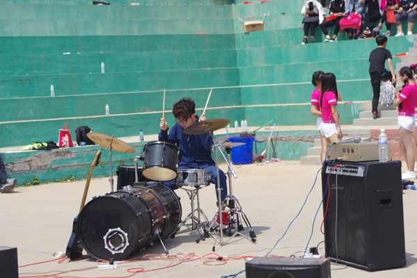 看,那边的美女啦啦队员运动吉祥物,带着阳光的微笑,一声声的加油呐喊,吸引了多少同学的眼球。听,那是管理学院与建工学院交相辉映的战鼓声,多么的振奋人心。电信与商务学院的即兴演出更是让我们随着他们的舞步而翩翩起舞。多彩的加油助威,更是给黄海的运动健儿们注入新鲜的活力。