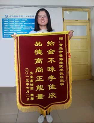财经学院14国本2班李佳欣同学于2015年5月30日14时左右在唐岛湾附近游玩时捡到一个钱包,钱包内现金1000余元,银行卡数张。李佳欣同学当时立刻把钱包交给了唐岛湾的保安人员,后通过保安人员找到失主。失主高先生于6月3日一早找到黄海学院财经学院送来了锦旗,表示感谢。