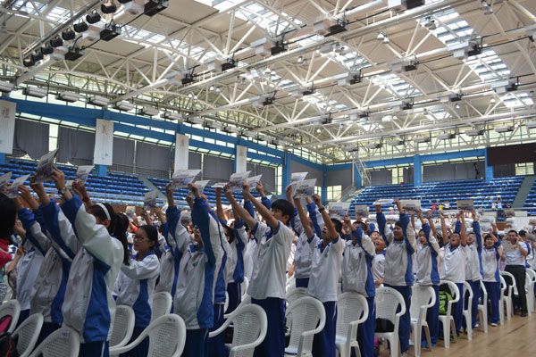 在观看了李阳老师宣传片后,伴随着同学们的欢呼声李阳老师健步走上讲台,用互动问答式的精彩开场白瞬间点燃了现场的氛围,幽默、风趣的演讲带动了同学们的学英语热情,感染了在场的每一个人。他采用大家喜闻乐见的互动形式,与同学们疯狂互动,时而向在场的师生提问并现场作答,通过手势和肢体语言向大家讲授了学好英语及提高英语口语水平的方法,充分调动了同学们学习英语的热情;时而不忘勉励同学们要珍惜时光、感恩父母的养育之恩和老师的辛勤培养,全力以赴地操练好英语。他还亲自带领学生现场进行英语训练,体育馆上空回荡起嘹亮自信的齐读单词与句子声。在李阳老师的感召下,同学们积极参与,激情澎湃,不仅认真记下李阳老师赠送的8句学英语箴言,同学们还踊跃上台,与李阳老师进行疯狂英语朗读PK,掀起了报告会的一个个高潮。整场报告会成了掌声、笑声、欢呼声、朗朗读书声的海洋。