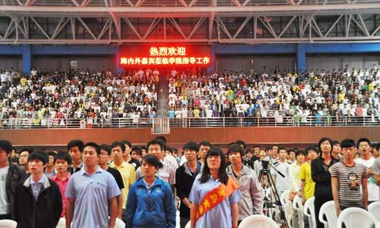 2011年5月26日晚,我院在室内体育场隆重举行“让生命充满爱”弘扬社会主义荣辱观大型爱国主义演讲报告会。香港汤恩佳孔子思想宣讲团副团长、上海修贤教育机构签约讲师、我国青年演讲家李亚军先生应邀到校演讲。全院三千多名师生员工到场聆听。