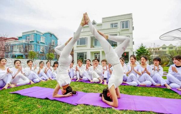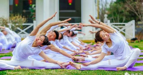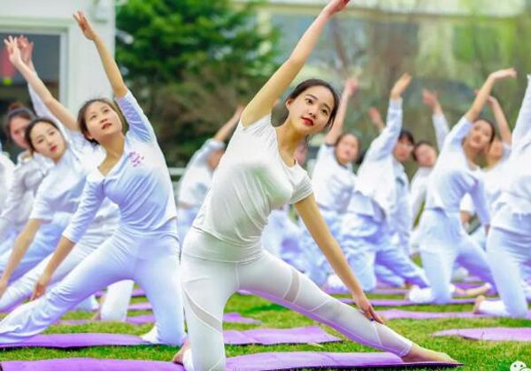 春天,万物生长,在空气清新的户外练习瑜伽,让人身心舒畅。草地上,紫色的瑜伽垫整齐排开,身穿浅色瑜伽服的大学生们,整齐地变换着瑜伽动作,或是简单,或是高难度,尽显力量和舒展之美。