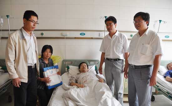 姚文标的母亲接到爱心捐款之后潸然泪下,万分激动的说:“非常感谢学院董事长、感谢所有领导、感谢所有老师和同学们…俺一定好好治疗,让文标好起来,早点回到学校…”。孙兆忠处长对她说:“学院领导和师生非常关心并为您着急,纷纷表达自己的爱心,到我们来之前捐款活动还在继续,后续的捐款也会及时送过来” ,并对姚文标说“希望你安心治病,保持一个好心态,争取早日康复,尽早回校学习……”姚文标班主任顾东阳还带来了班里同学送的小礼物和笔记本,笔记本上签满了班里所有同学的祝福。姚文标一直躺在病床上,眼神里流露着深情的谢意。