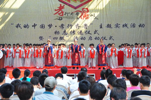 据了解,5月28日“我的中国梦·孝行齐鲁”主题实践活动启动以来,活动已经在我省149所高校90万大学生中陆续开展。活动以“孝”为中心,以“感恩、关爱、分享、传承”为理念,以曲阜为起点,推及17城市、百余所高校,分线路传递“孝心标志”并在高校中开展一系列孝心活动。激发高校广大青年学生从小事做起,从自身做起,从孝顺父母做起,由家及国,不断提升道德修养,让“孝文化”的正能量影响到每一位高校学子继而影响到全社会,成为实现我们伟大“中国梦”的强大精神动力。
