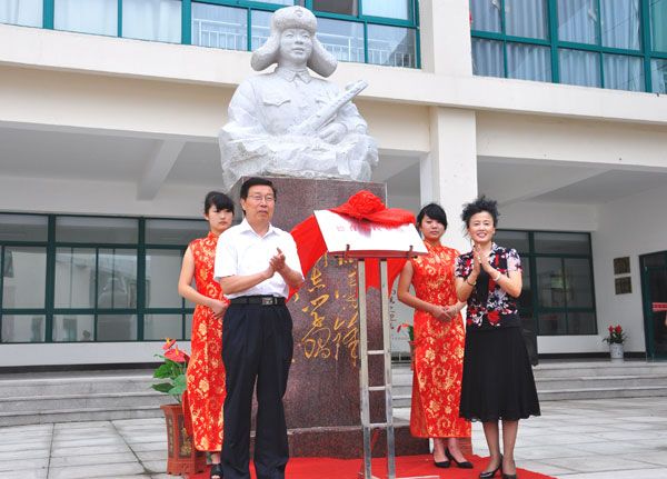 来访领导和学生与雷锋像合影