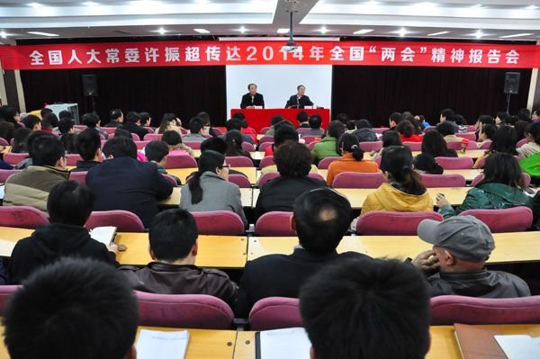 许振超副主席主要介绍了2014年“两会”的概况,主要会议精神及大家关注、关心的“两会”热点和焦点问题。许副主席说,2014年是全面深化改革的第一年,今年“两会”从接待、住宿、会场布置等安排上都体现了厉行节约的新会风,会场纪律更为严格,会风有切实转变。李克强总理作了任职总理后的第一个政府工作报告,本次政府工作报告如实反映了2013年的国家实际情况,从经济结构调整、物价控制、生态环境治理、产业结构升级、现代职业教育体系建立等多个方面阐述了去年的成绩和2014年的九项任务,接地气、聚民智、增信心,是一份务实坦诚的政府工作报告。许振超副主席在报告中强调:“过去的知识培养不出企业需要的人才,现在的学校应该培养未来需要的人才。”这既是他对“两会”精神的理解,也是他对高校教育模式转变的思考和期望。