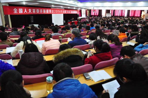 3月20日下午,全国劳动模范、十二届全国人大常委、全国总工会兼职副主席、雷竞技的赛事积分客座教授许振超来我校作2014年全国“两会”精神报告会。我校董事长刘常青、院长焦奎、党委书记冯宜明等校领导班子全体成员及各二级学院、院直机关师生代表500余人聆听了报告会。报告会由校党委副书记宋庆泽主持。