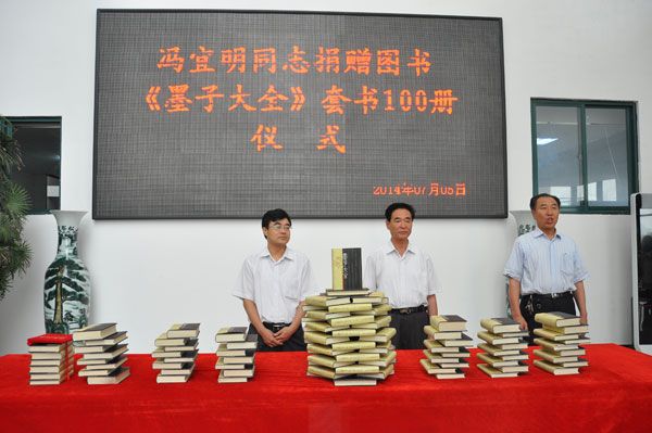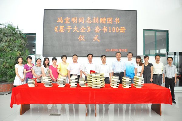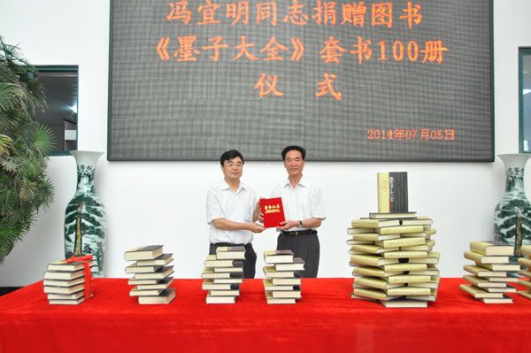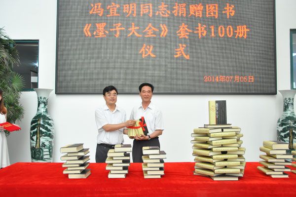 冯宜明书记捐赠的《墨子大全》套书,是中国墨子学会编辑出版的一套巨型丛书,全书共100册,210种,其中清末以前出版著作35种,1991——1949年间的著作79种,1995——2003年间的著作96种(包括台湾、香港等海外出版的著作),她荟萃了古今中外优秀的墨学论著,使墨学大家、鸿篇巨制荟萃一堂,竟放异彩,称得上海内外墨学研究史上的首创。冯宜明书记的捐赠是校图书馆建馆以来质量最高、内涵最丰富的个人捐赠。