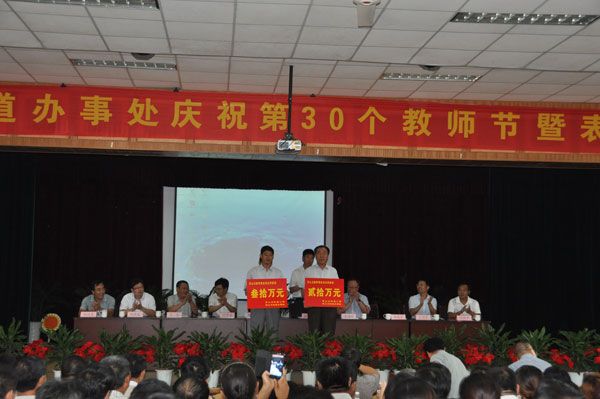 9月9日,为庆祝第30个教师节的到来,灵山卫工委、灵山卫街道办事处在灵山卫中学阶梯教室隆重召开灵山卫街道办事处庆祝第30个教师节表彰大会,向全街道广大教师、教育工作者以及退休教师致以节日的问候,表彰在过去一年为街道教育事业做出突出成绩的优秀教师、优秀教育工作者、优秀班主任及优秀学校先进集体。灵山卫街道工委书记刘学宏、办事处主任杜文秋等领导及街道党政主要负责人、分管负责人及各学校师生代表、学生家长代表共约350余人出席了大会。我校董事长应邀在主席台就座。我校被授予“灵山卫教育事业突出贡献奖”,我校党委副书记宋庆泽代表我校上台领奖。