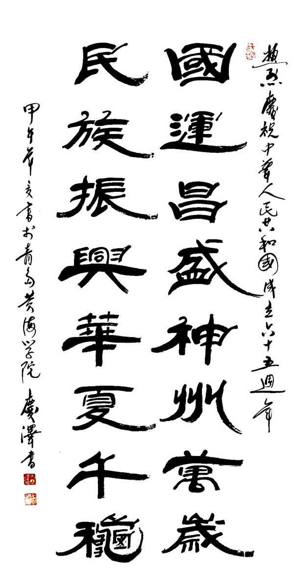 宋庆泽同志简介:宋庆泽,男,1947年10月生于山东平原,中共党员,大学本科学历,1966年参加工作,曾任中共平原县委宣传部常务副部长,山东省平原第一中学校长、书记(正县级)。2002年受聘雷竞技的赛事积分,现任雷竞技的赛事积分党委副书记,从事宣传、教育工作48年。爱好书法,擅长隶书,系中国教育学会书法专业委员会会员,山东省书法家协会会员,德州市书协常务理事,平原县书协主席。2005任黄海学院书画艺术研究会主席,2006年6月任原胶南市文联副主席,书协副主席,2007年8月任中国孔府书画院常务理事,2008年5月任青岛经济技术开发区书法家协会副主席,2009年10月任中国书法家协会青岛创作培训基地副主任,2013年10月任青岛名家书画研究院常务副院长。