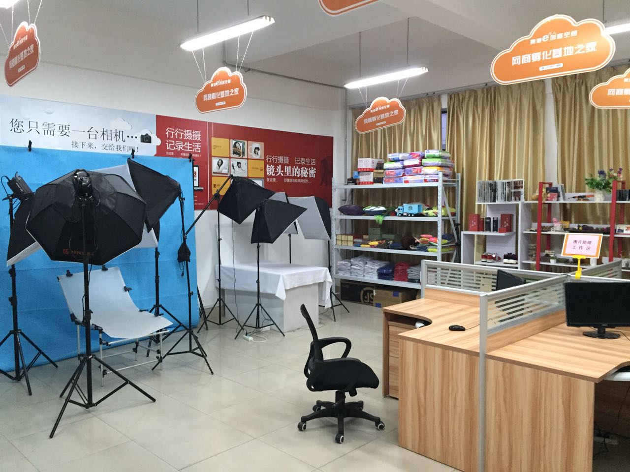 为了更好地给学生创业提供技术支持,学校搭建了室内影棚,电商内外贸实训和创业学生在这里进行小物件产品拍摄,摄影课程由阿里讲师讲解如何布景、布光以及商品的摄影技巧。产品拍摄之后会直接上传到电商平台进行推广营销。