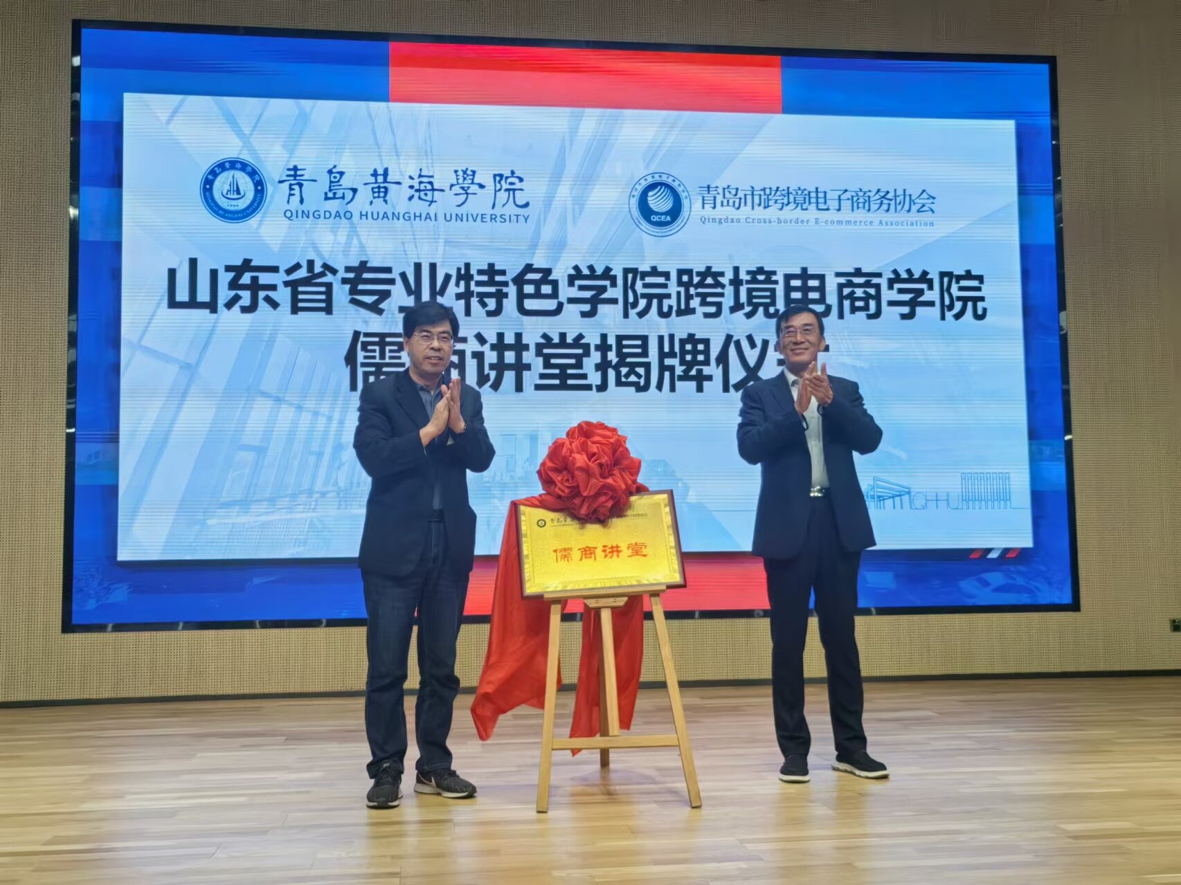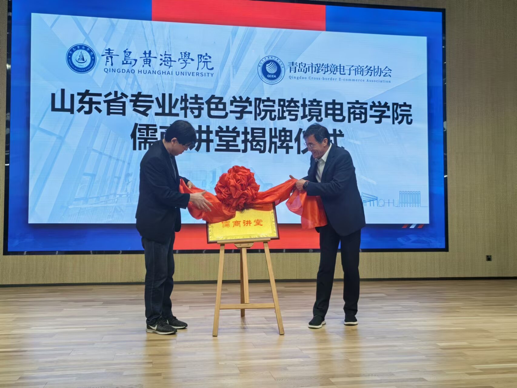青岛黄海学院教学工作部部长杨振光与青岛跨境电子商务协会执行会长兼党支部书记、青岛华怡中通服饰股份有限公司董事长史立刚共同为儒商讲堂揭牌。