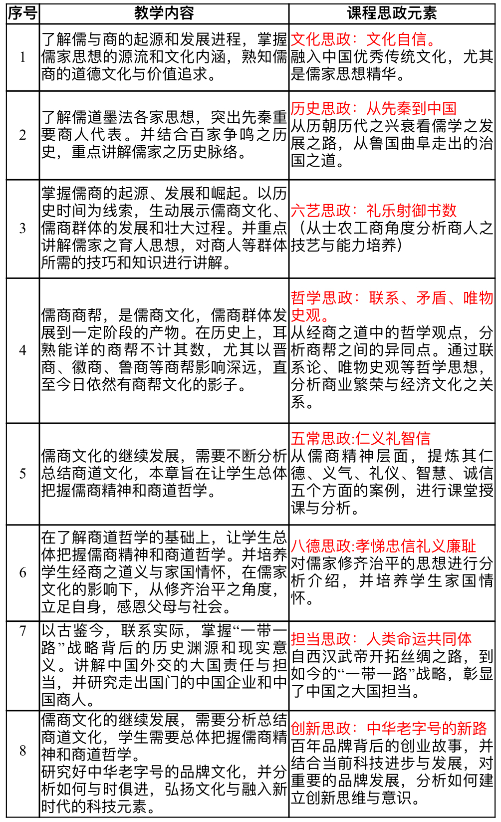儒商之道的课程思政定位,是从博大精微的儒家文化中汲取营养,让儒家思想深入商人的骨髓当中,目的是把学生培养成为有担当、有内涵、有情怀、有国际化视野的现代儒商。在八次授课进度中,融合了历史、文化、五常、六艺、八德、哲学、创新、担当这八个方面的思政要素,贯穿课程授课体系。