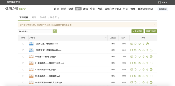儒商之道作为校级在线课程,在2018年就进行了网课的制作,并获得校级金课,建立了完备的网络在线课程资源。资源形式多样化,由音频、视频、文档和图片等构成。