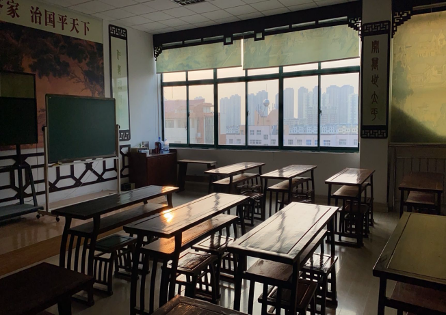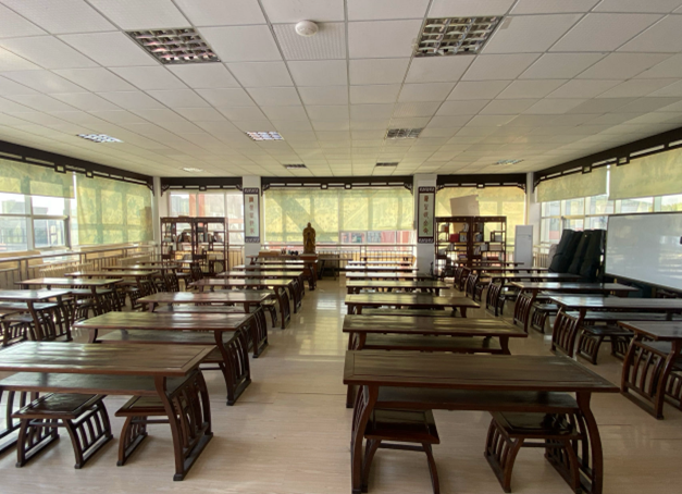 授课地点为知诚楼的孔子学堂,经过文化元素的设计,学堂内孔子像、群贤图、经典古籍等,都对儒家文化的讲授助力添彩。