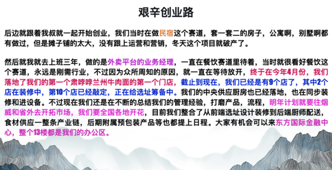 2023年的上半年,是陈辉同学的餐饮企业快速发展的半年,从一家店面到9家店面,快速增加的数量,说明的是品牌的建设和质量经营的理念。其装修-配货-原材料等产业链的完整化模式,对企业发展提供了更大的前景。同时,在2023年12月,企业在黄岛区东方国际金融中心13楼建立了办公场所,并与黄海学院进行了交流互访。