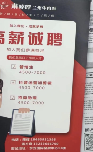 2023年11月,青岛黄海学院举行了校园招聘会。在与会的320家企业中,陈辉同学的餐饮企业也来校招聘。经过宣传单页设计,工资商定,创业培训和面试沟通,首批引进了51名黄海学院的学生进入办公场所参观,并进行了管理培训。