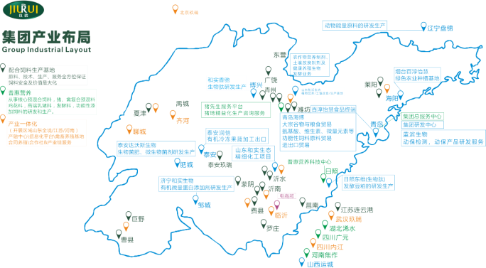山东玖瑞农业集团成立于2013年,总部位于青岛,是国家高新技术企业、山东省农业产业化龙头企业、省领军饲料企业。集团自成立以来,植根山东大地,逐步拓展湖北、四川、河南、东北、北京等地区,围绕种植、养殖、饲料、食品、终端消费,涉及生物技术及动植物营养研发、饲料及原料生产、养殖、精细化工、生物肥料生产、绿色种植、进出口贸易、金融担保等多领域,秉承“玖瑞农业,恒久为民”的企业理念,致力于打造从田间到餐桌、绿色健康、可持续发展的现代化全产业链农牧食品生态体系。