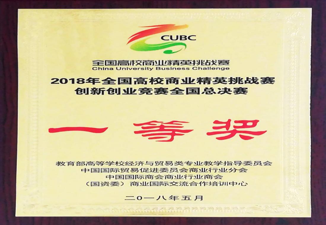 2018年5月 全国高校商业精英挑战赛创新创业竞赛全国总决赛一等奖、最佳院校组织奖