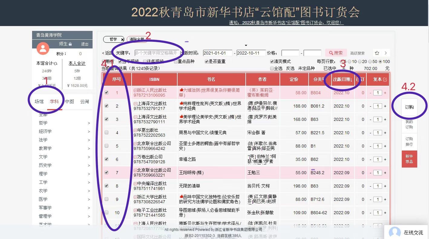 本次选书主要为新书,选书时您可对“出版时间”进行预先设置,以便选择2021年以来出版的图书。您所需的图书如果涉及非2021年以来出版的图书,可在“青岛黄海学院图书馆”微信公众号的“读者荐购”模块填写具体书目信息,图书馆会单独进行订购处理。