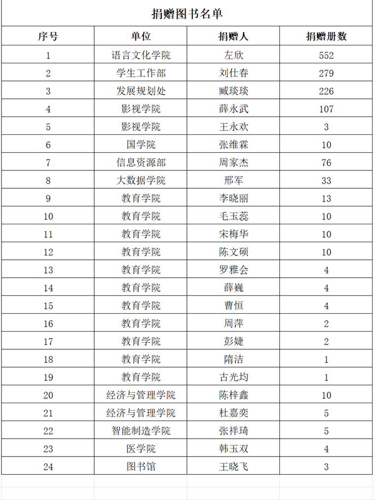 为深入推进全民阅读,丰富图书馆馆藏资源,形成“爱读书、读好书、好读书”的书香校园氛围,自“书香传承,捐涓涌流”第三届图书捐赠活动倡议书向全校师生发出至今,校图书馆共收到集体和个人捐赠图书共计一千三百余册,涵盖文学、艺术、教育、医学、历史、地理、社会科学等多种类型。